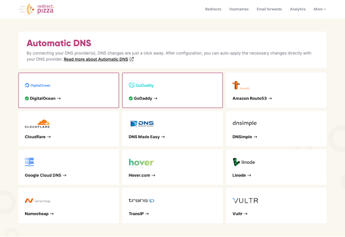There are two primary components of domain redirection: the source domain and the target domain. The source domain is the original domain that you want to redirect traffic from, while the target domain is the new domain that you want to redirect traffic to. In the interface of redirect.pizza, we also call the target domain a “destination” domain.